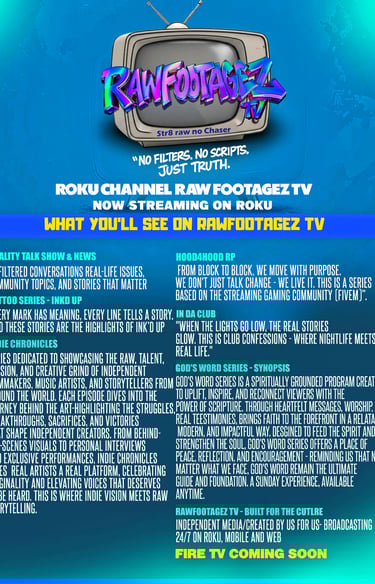 Raw Footagez TV is a powerhouse media brand built on authenticity, culture, and undfiltered storytelling, From hard-hitting conversations to real community stories, our mission is simple--capture life exactly as it is...