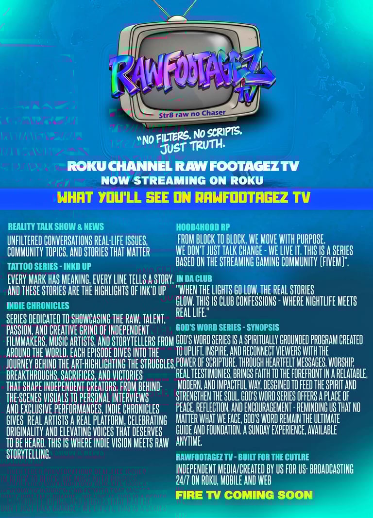 Raw Footagez TV, brings you unedited stories, powerful personalities, and a lineup that speaks directly to the streets, the creatives and the culture that inspires us.